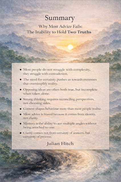 This becomes even more important when we consider how we advise others, because here there is a subtle danger. Most people give advice from identity. Very few give advice from clarity. They speak from what they would do, what has worked for them, what aligns with their own values and experiences. And whilst that can be helpful, it is not neutral. It is shaped by bias, whether acknowledged or not. So advice must be given with caution, because until you are able to see the situation more fully, how do you know whether your input is supporting what is needed, or quietly distorting it?